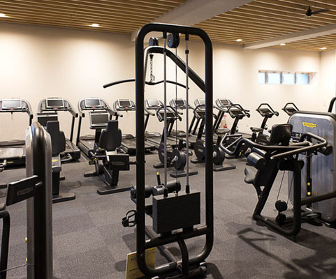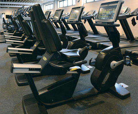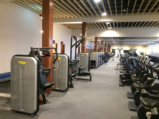 スタイリッシュなデザインでオリンピック選手村のトレーニングルームに採用されている人気のイタリア、テクノジム社フィットネスマシンが並ぶマシンジムエリアです。カーディオマシンはランニングマシン20台、バイク5台、リクラインバイク5台、ヴァリオ3台、クロスオーバー2台、トップ1台の充分なマシン数がございます。